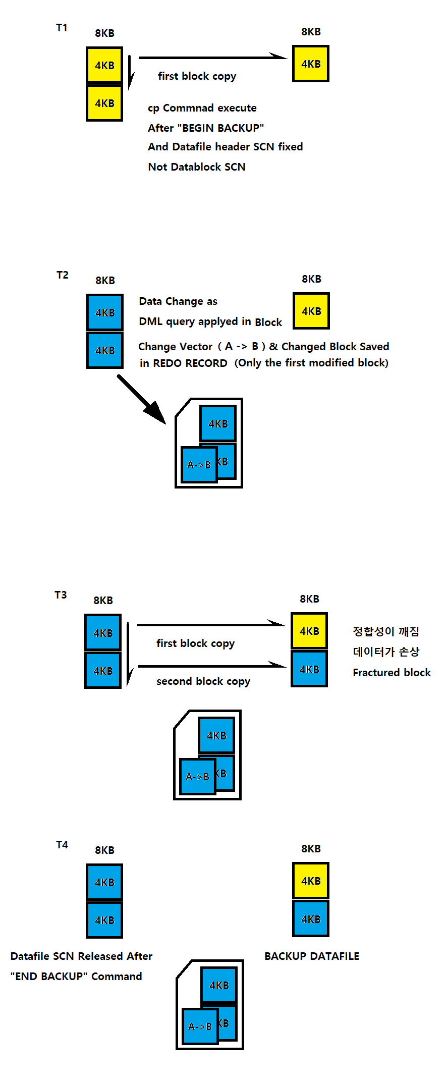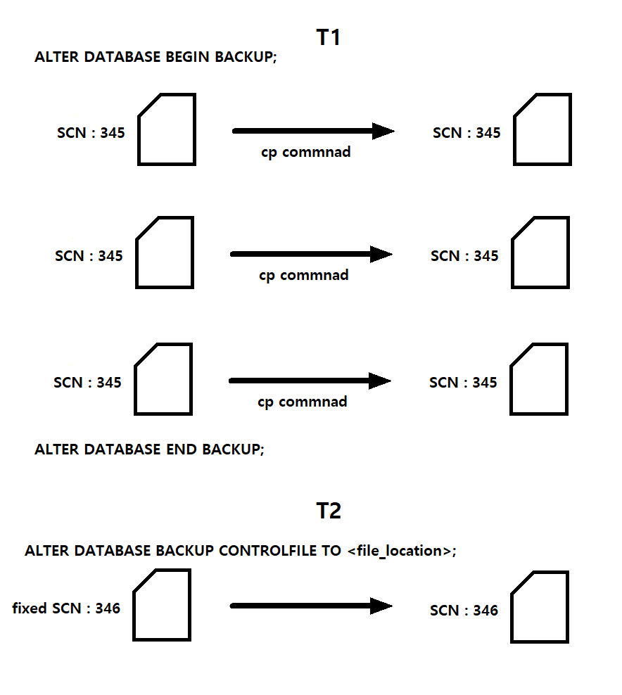 이렇게 되면 사용자가 BEGIN BACKUP을 수행하고, 사용자가 cp명령으로 Datafile들을 복사하여 백업을 받을 때,