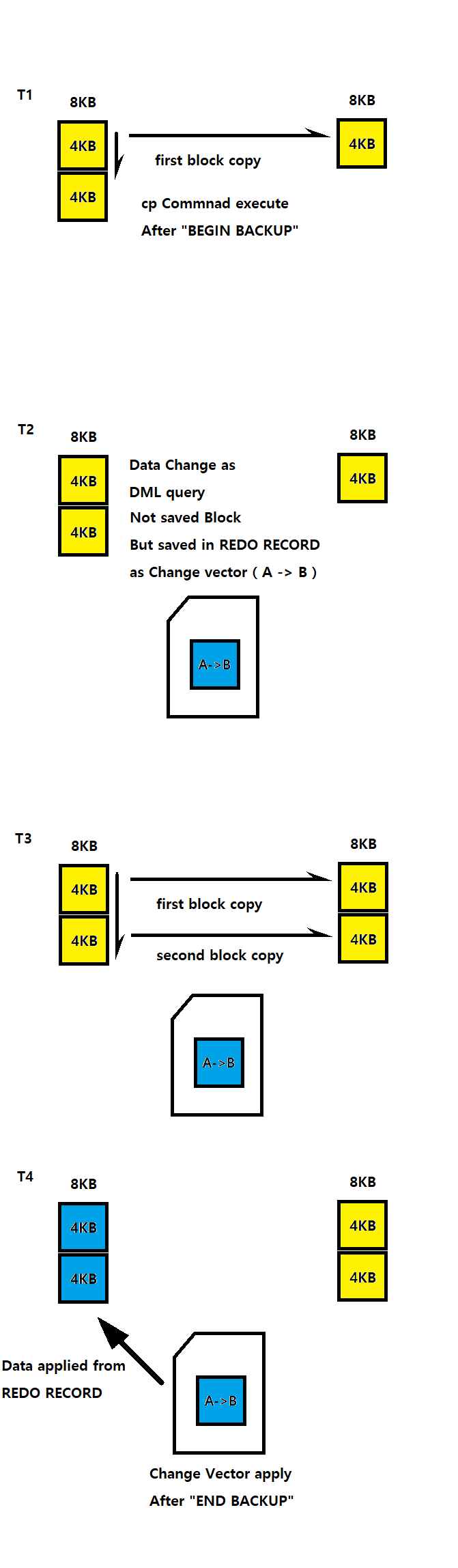 cp명령을 수행하는 도중 Data가 변경되었던 정합성이 깨져버린 블록을 대체하며 초기화 시켜준다.그리고 초기화된 블럭에 Chage vector ( A -> B ) REDO record를 적용시켜 복구를 시켜준다. 이렇게 된다면, cp명령을 수행하는 도중 Data가 변경되었던 ( 정합성이 깨져버린 ) Data block에 대해 정합성을 맞춰주어 온전한 백업 복구데이터가 될것이다.