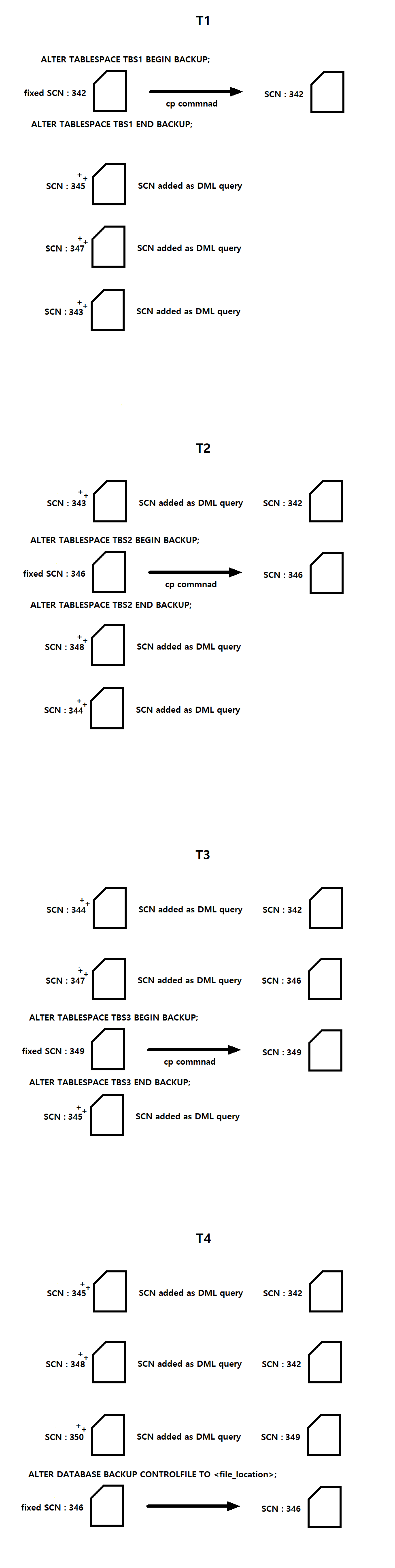 COMMIT이나 CHECKPOINT가 발생할 때, 쿼리에 의해 변경되는 데이터들은 BEGIN BACKUP 이전과 동일하게