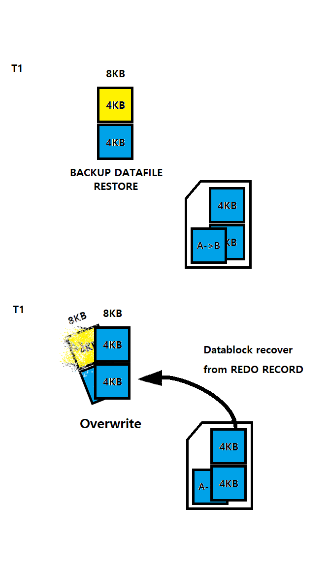 따라서 복구하는 동안 이 블록(cp명령시 깨진블록)은 "REDO"에서 완전히 다시 꺼내와져 쓰여지고, 온전한 블럭과 일치하도록 전체 블록 이미지를 복구한 RESTORE 파일에 기록합니다. REDO에서 깨진블록을 복구 할 수 있습니다.